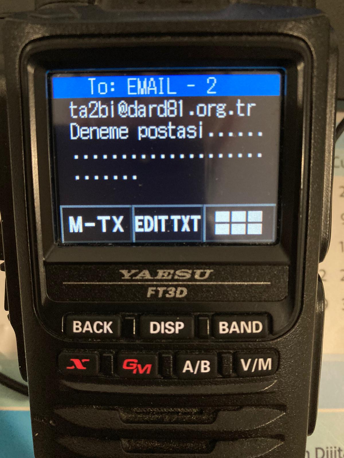 Aprs sisteminin güzel yanlarından birisi de bulunduğunuz bölgede internete ihtiyaç duymadan Rf üzerinden E-mail göndermenize ve almanıza imkan sağlamasıdır. Çok işinize yarayabilecek ve kullanması çok basit bu özelliği sizlee paylaşacağım. Öncelikle Aprs özelliği olan telsizinizde mesaj gönderme bölümünde bulunan alıcıı kısmına EMAIL -2 yazıyoruz. Mesaj alanına da mail adresinizi yazıp, bir boşluk bırakarak mesajımızı yazıyoruz. Aşağıda bir örnekle size anlatayım.